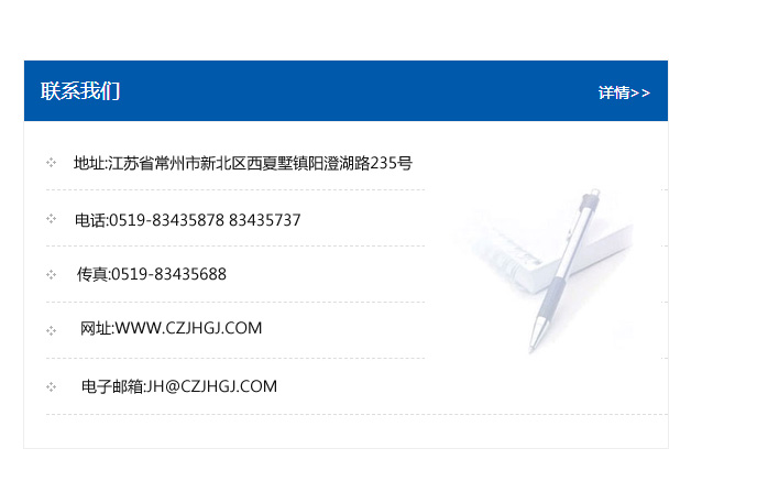 地址:常州市新北區友邦商務大廈1幢16、17層  電話:0519-85101652  傳真:0519-85112595  郵編:213022  網址:www.cz-jiayue_cn.liebao5.com  郵箱:xiajifengaa@163.com